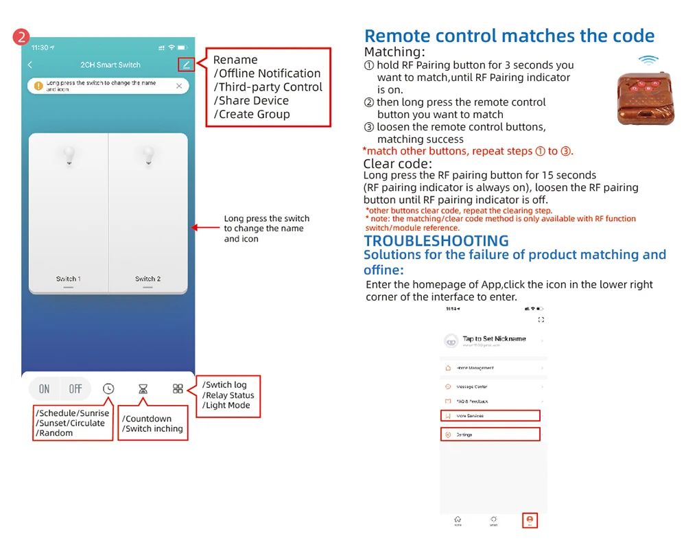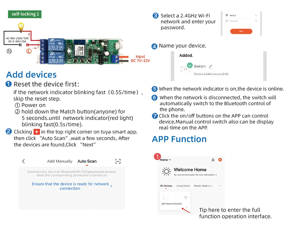 1.Inching mode : Switch on channel 1 , channel 1 will be automatically closed after 2-3600s. Channel 2 is same to the channel 1 .