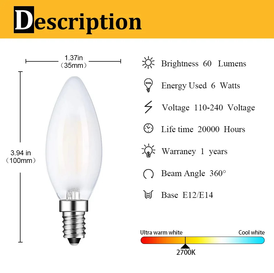 4W 6W Retro LED Candle Filament Bulb C35 Frosted Light Bulb E12 E14 Dimmable Edison Screw Light Lamp Chandelier Warm White 2700k