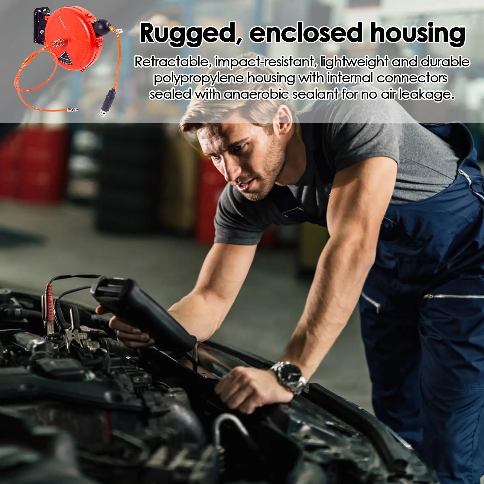 3.Sturdy and Reliable: Our air hose reel boasts a reliable, enclosed PP housing that ensures no air leakage thanks to well-sealed internal connectors. Its sturdy, impact-resistant frame and easy retractable design make it the perfect compressor hose reel for any rugged workplace.