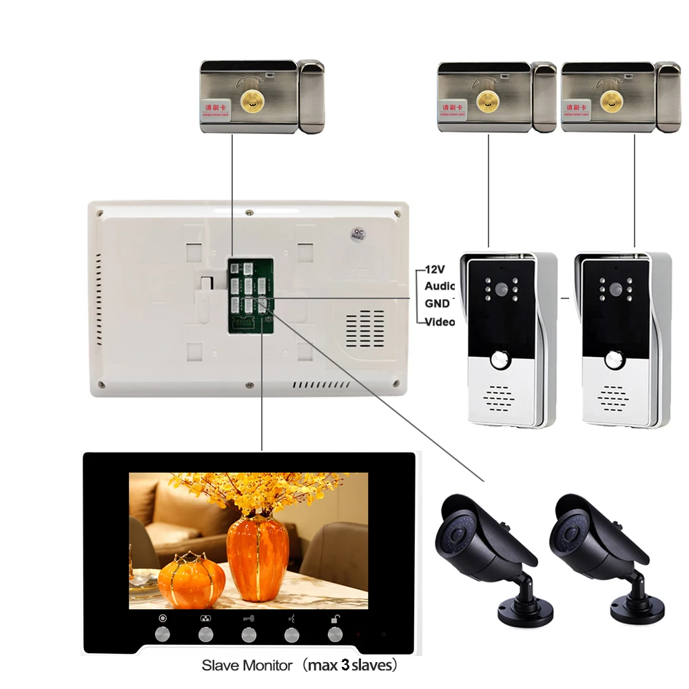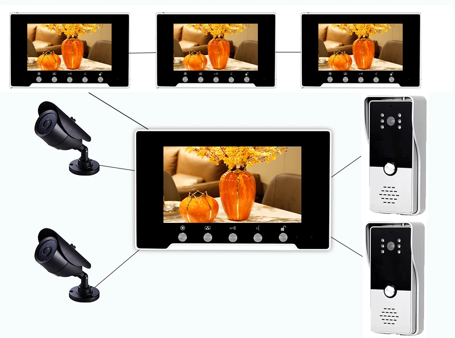The system could support 4 monitors 2 doorbells and 2 CCTV Cameras and alarm sensors