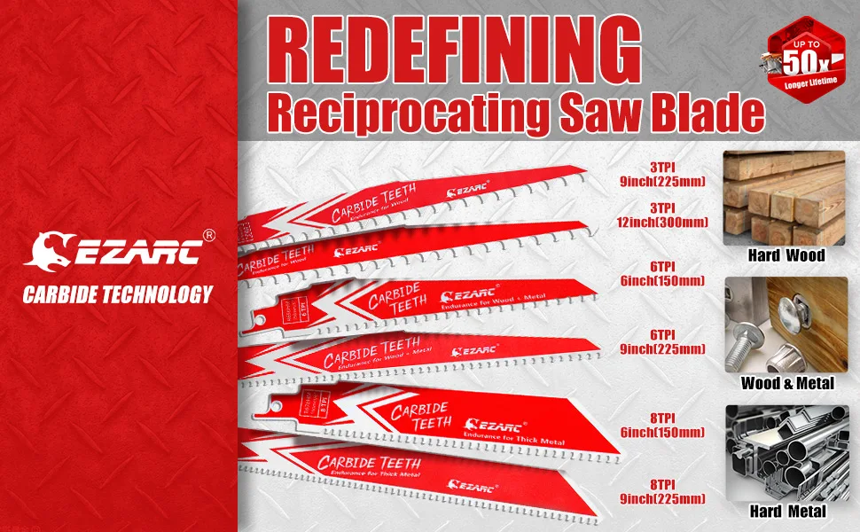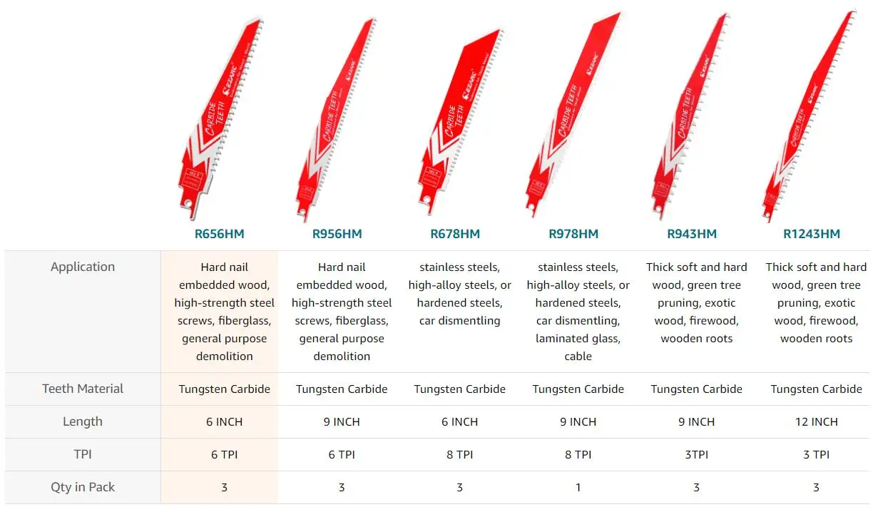 EZARC 3Pcs Carbide Reciprocating Saw Blade R656HM Endurance for Hard Wood and Metal Demolition 6 Inch 6TPI, 9 Inch 6TPI|Saw Blades|