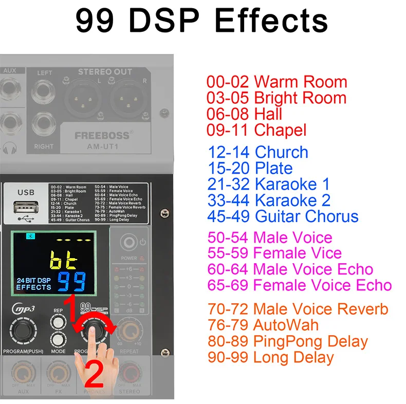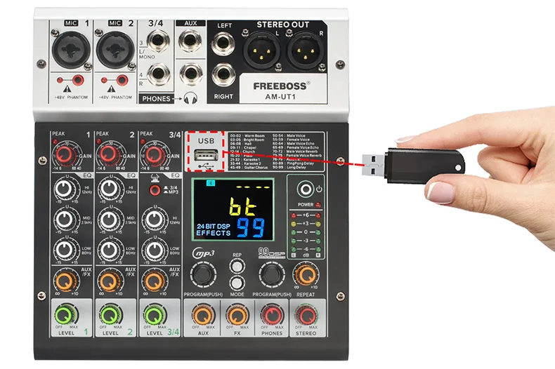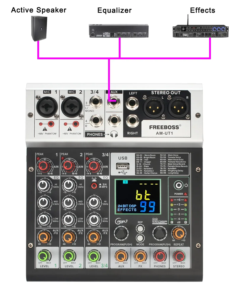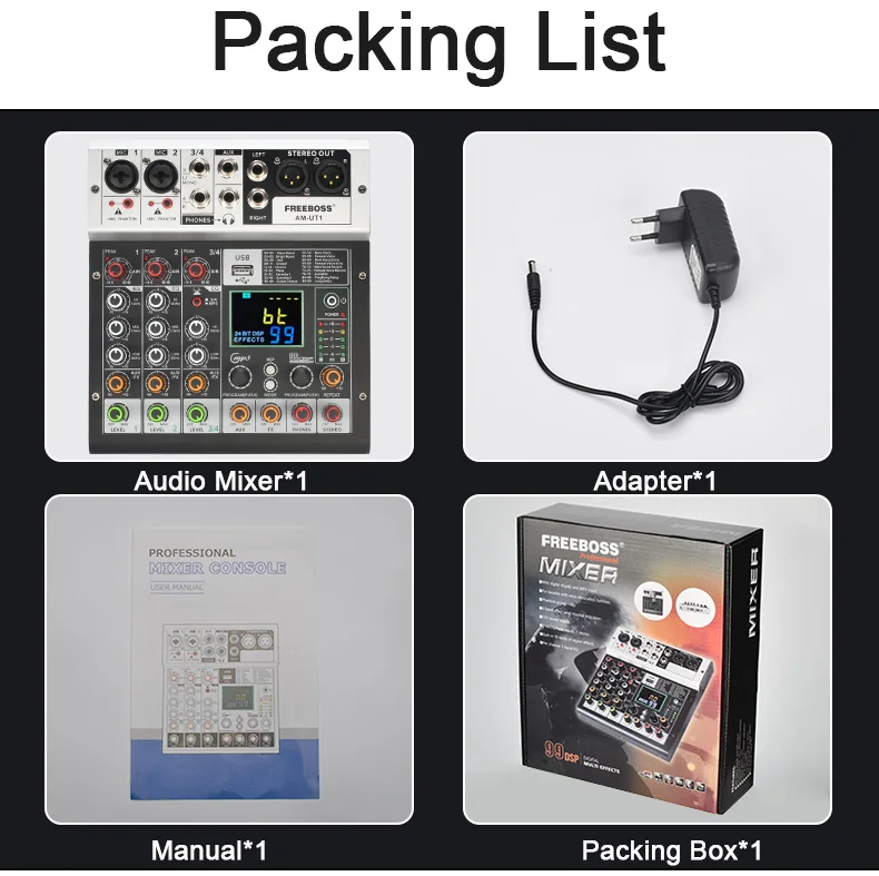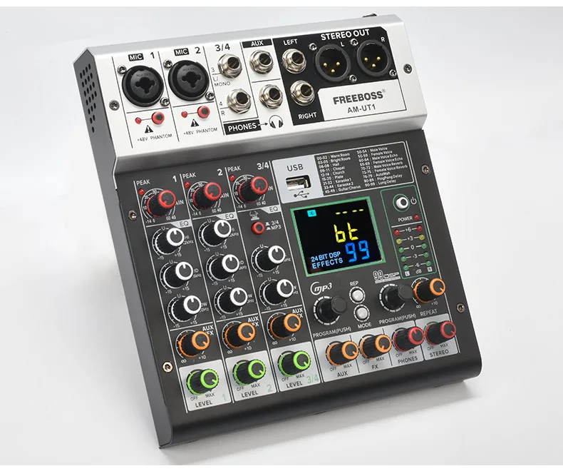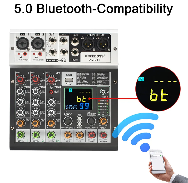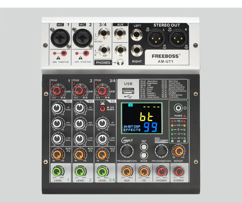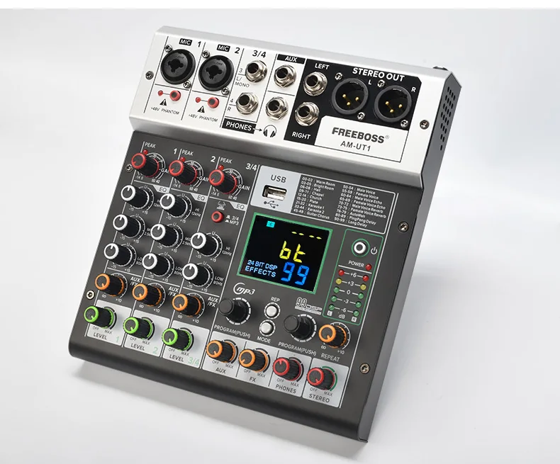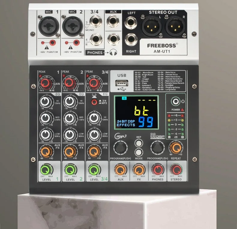 Freeboss 4 Channel Audio Mixer 99 Effect 48V Bluetooth Dj Mixing Console USB PC Record Karaoke Home Party Sound Table AM-UT1
