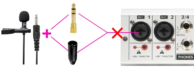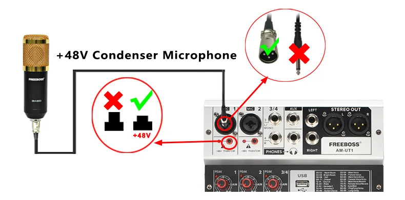 If your microphone is +48V condenser microphone, please connect it to mixer via XLR cable, and power on +48V phantom power.