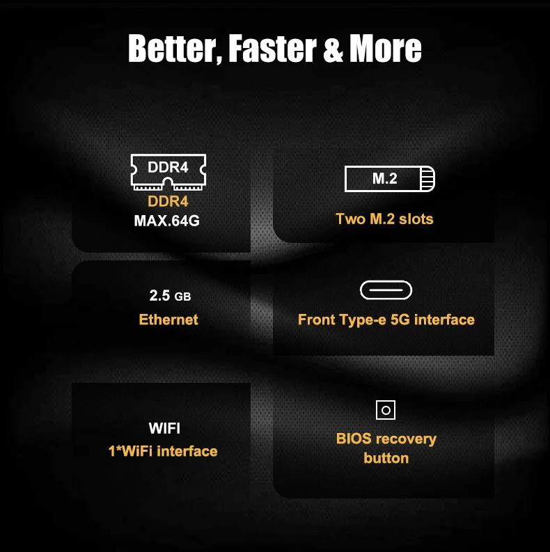 4 SATA3.0 and 2 M.2 NVME protocol interfaces (one on the front for 3.0 and one on the back for automatic recognition of 3.0 or 4.0 based on CPU)