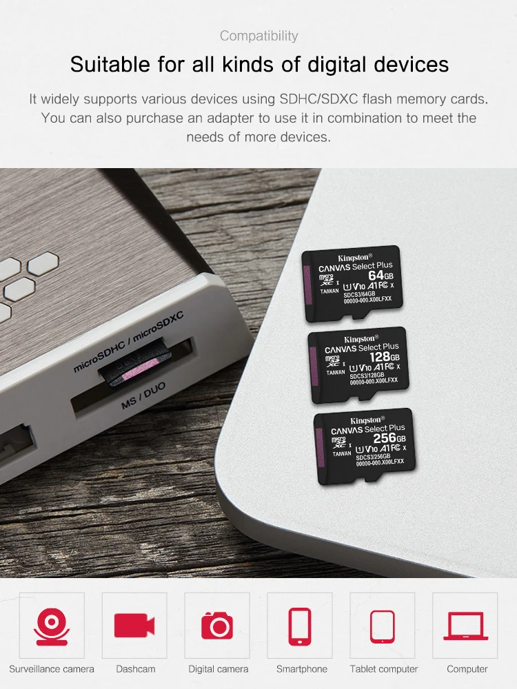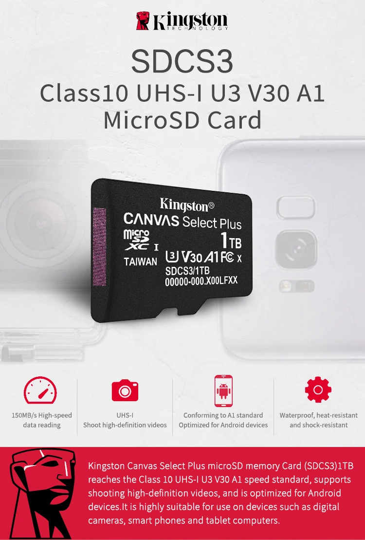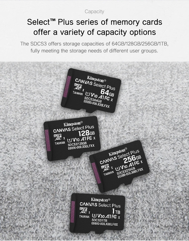 Kingston Canvas Select Plus Micro SD Card 32GB 64GB 128GB 256GB 512GB Memory Card C10 A1 Flash Card Up to 100MB/s read TF Card Microsd Flash Cards