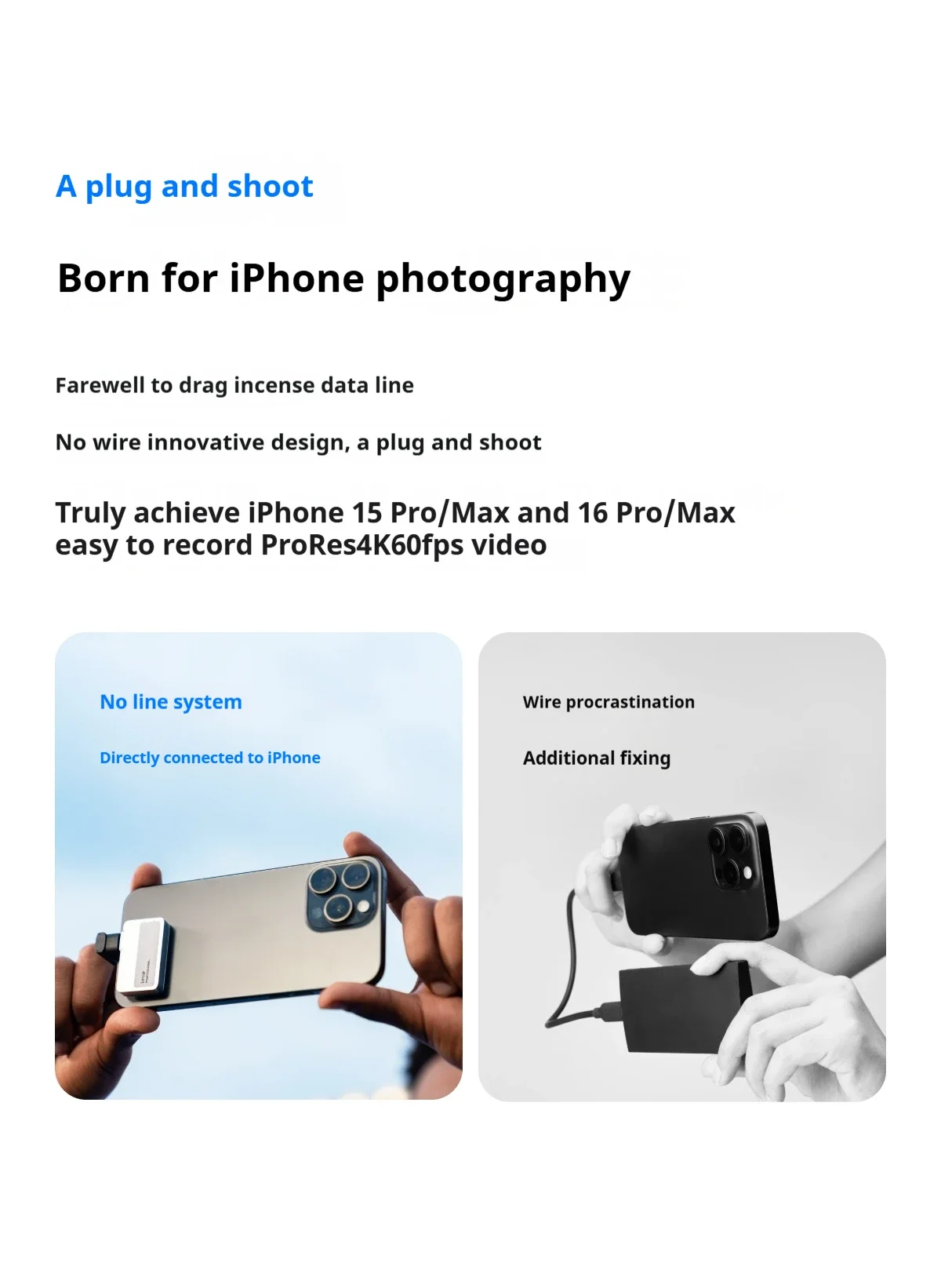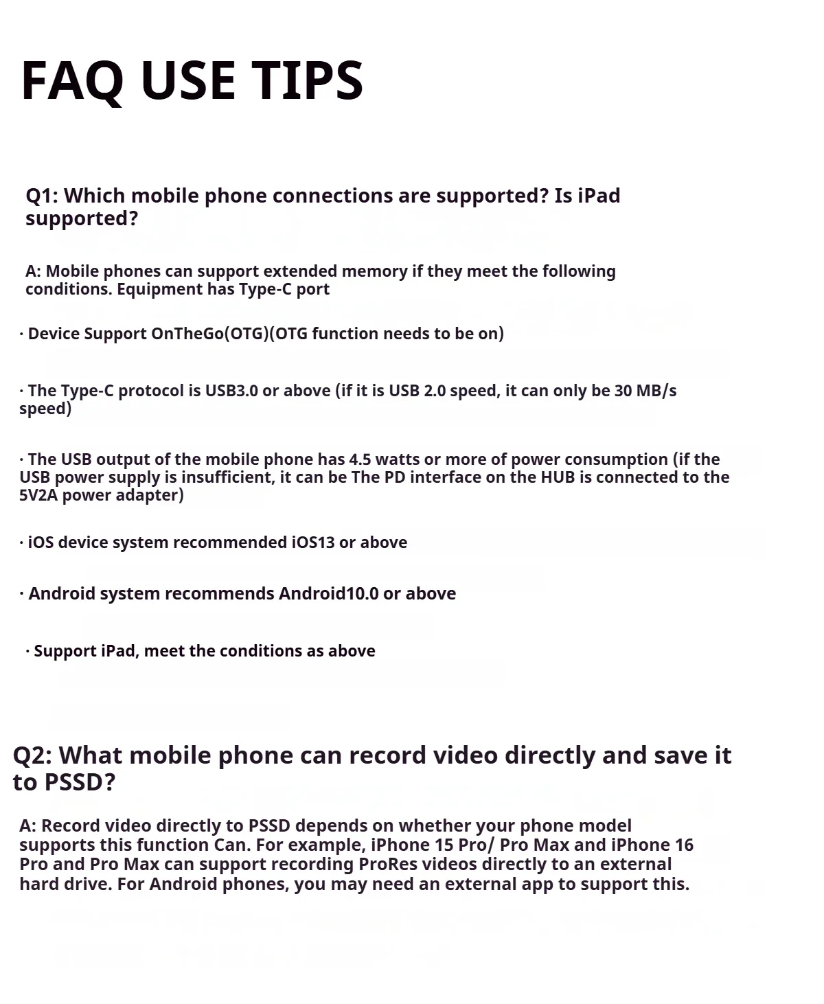 A:Recording video directly to PSSD depends on whether your phone model supports this feature. For example, iPhone 15 Pro/ Pro Max and iPhone 16 Pro and Pro Max can support recording ProRes videos directly to external hard disk. For Android phones, you may need an external APP to support this.