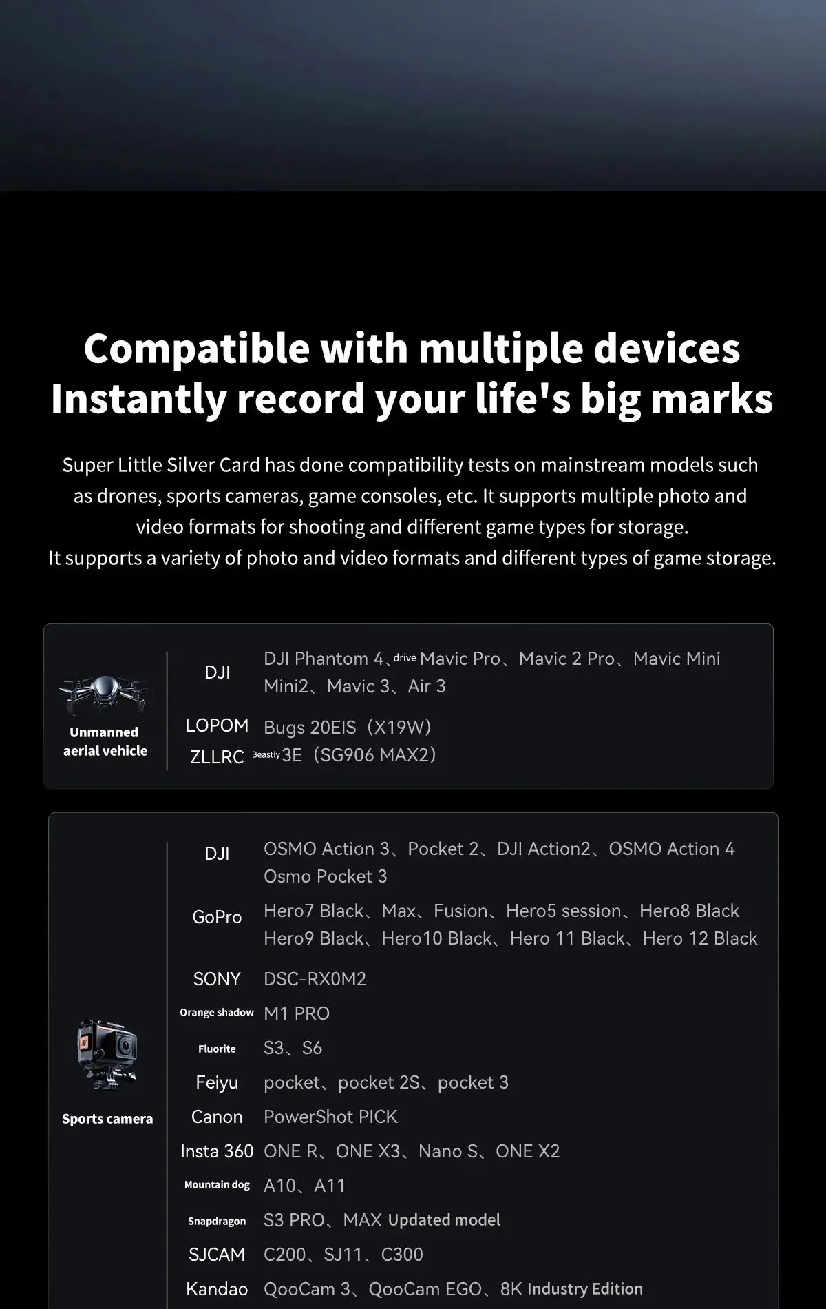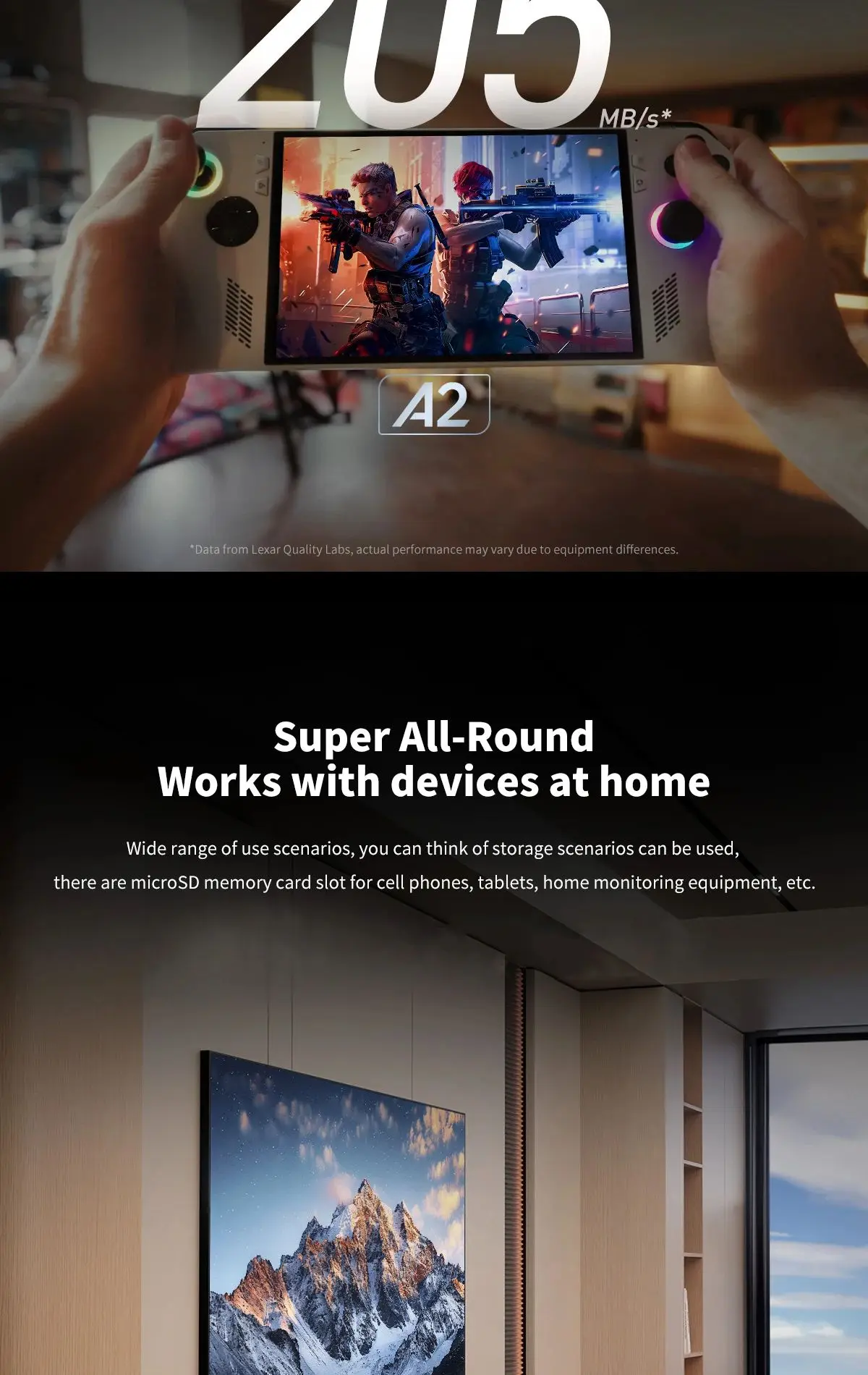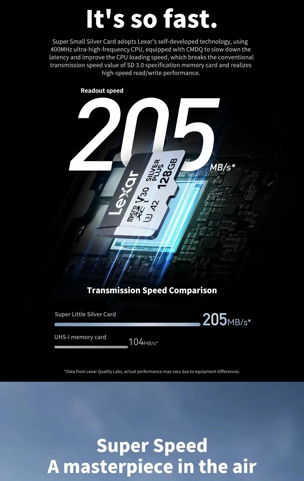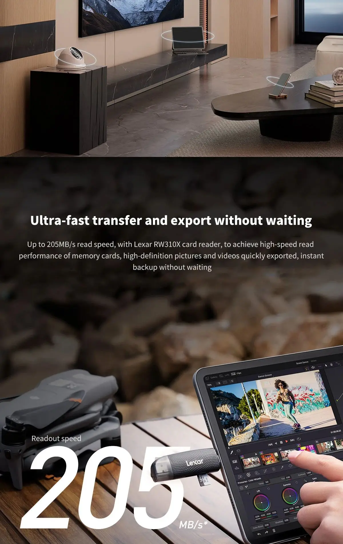 The Lexar Professional SILVER PLUS microSDXC UHS-I Card boasts exceptional read/write speeds of up to 205MB/s and 150MB/s and supports seamless recording of FULL-HD and 4K videos. Paired with the Lexar RW310x reader, its blazing-fast read speeds are fully achieved, significantly reducing wait times for data transfers. Reliable, durable, and compatible, it is perfect for drones, action cameras, handheld consoles, and more.Performance When it Counts