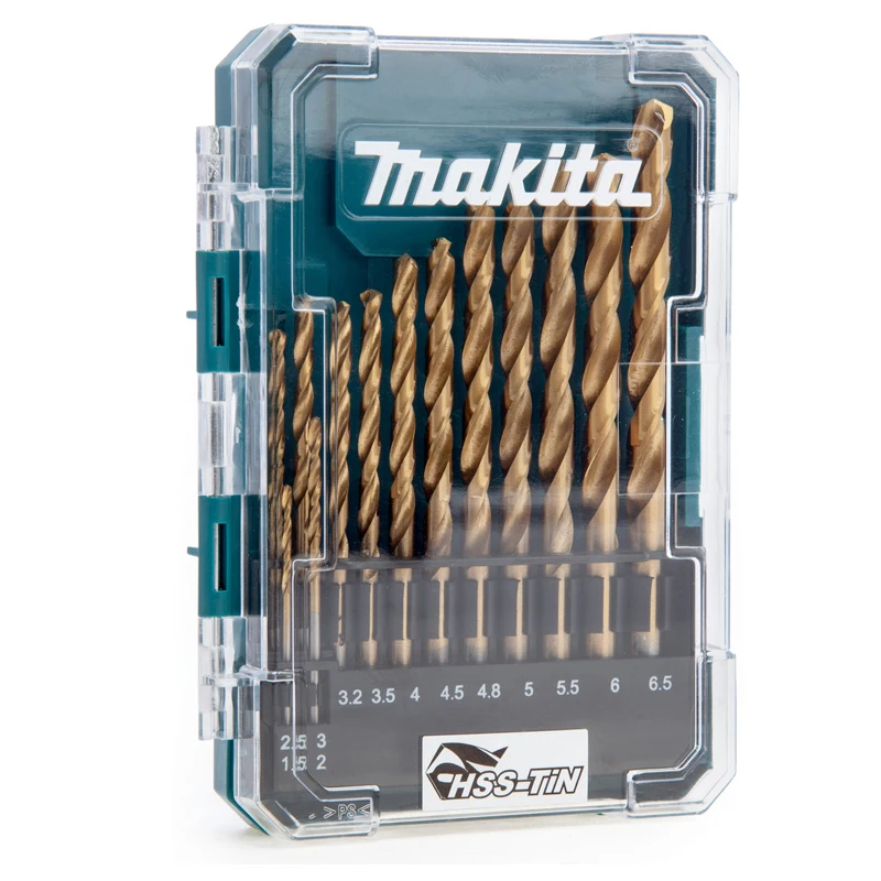 The Makita D-72855 is an Economy 13 Piece HSS-TiN Drill Bit Set with Straight Shanks in sizes: 1.5, 2, 2.5, 3, 3.2, 3.5, 4, 4.5, 4.8, 5, 5.5, 6 & 6.5mm suited to drilling metal. The Set is made from High Speed Steel with a titanium-nitride coating, this means that they produce minimal levels of friction and therefore reduce friction deposits. TiN-coated drill bits should last longer than uncoated bits, and you can often push them faster too. The high surface quality of this ground twist drill bit allows extended usage. It is suitable for use on alloyed and non-alloyed steel, malleable cast iron, sintered iron, new silver, copper, bronze and hard plastics such as perspex.