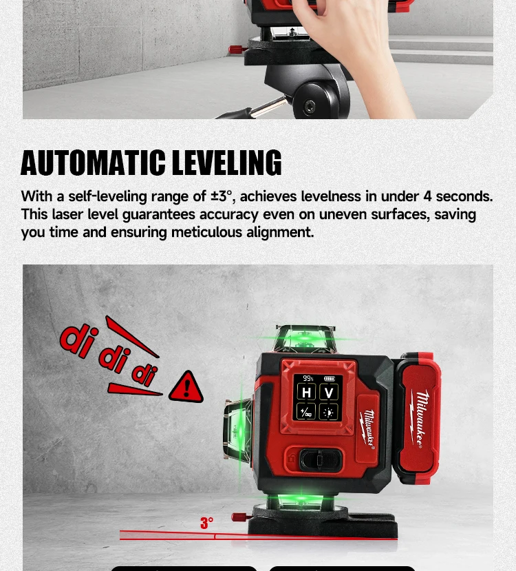 With a self-leveling range of ±3°, achieves levelness in under 4 seconds.This laser level guarantees accuracy even on uneven surfaces, saving you time and ensuring meticulous alignment.