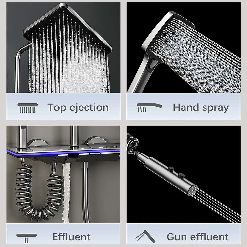 Modern Bathroom Faucet Set Wall Mounted LED Display Rain Shower System Bathtub Hot and Cold Mixer Crane Gun Gray Shower Full Set