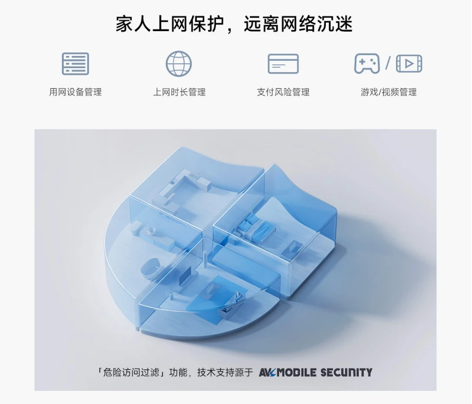 Support targeted management of family's internet devices through the Mi Home app, filter out inappropriate websites, and limit the usage time of popular apps to cultivate healthy internet habits. A powerful protection mechanism can prevent network attacks and maintain network security.