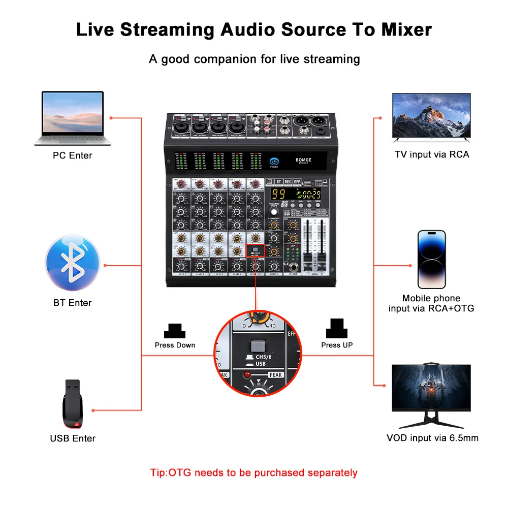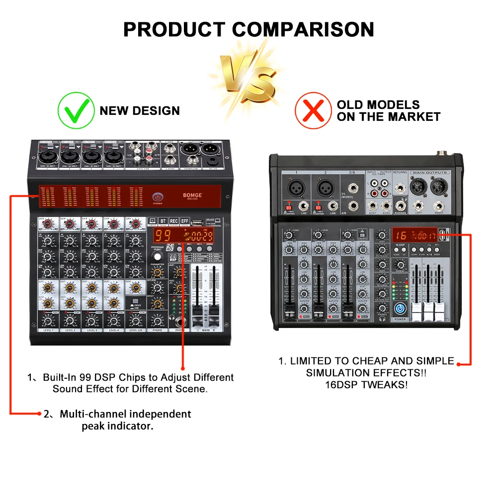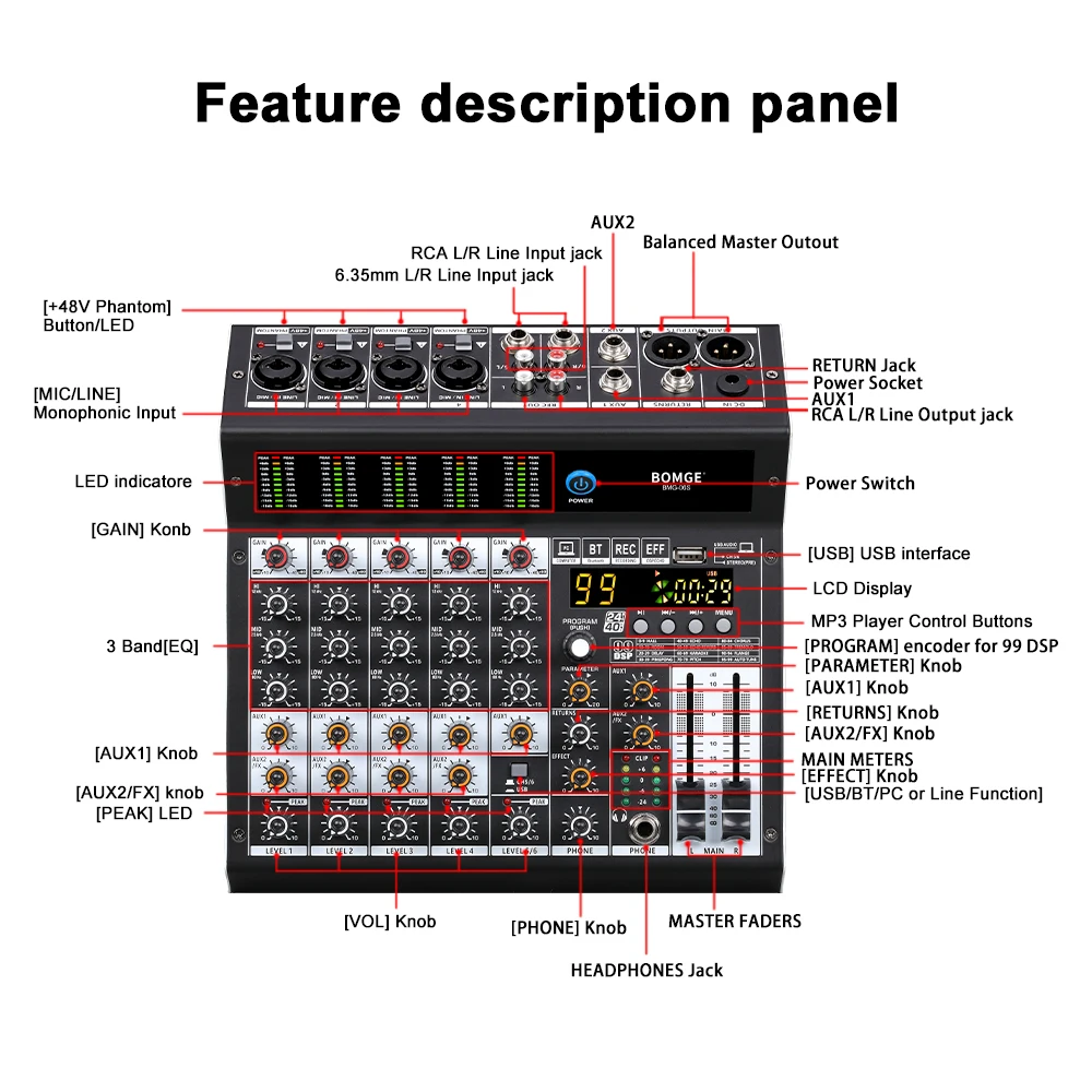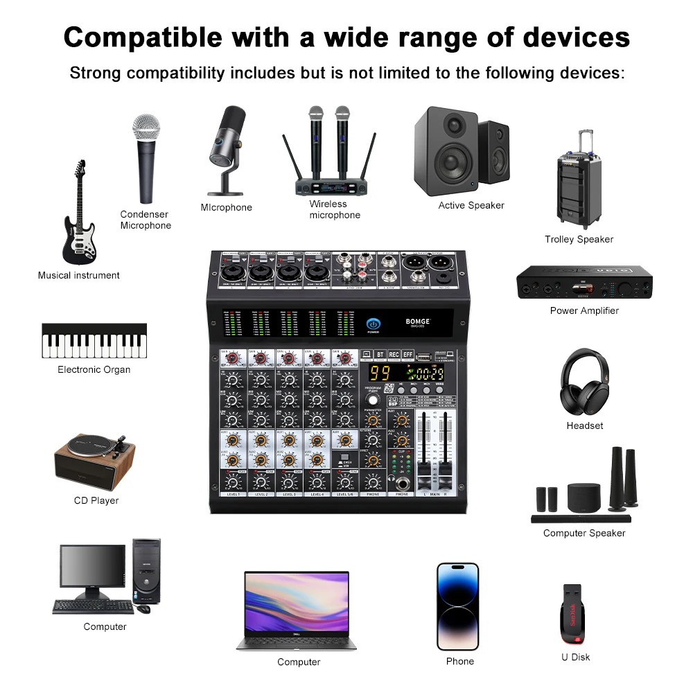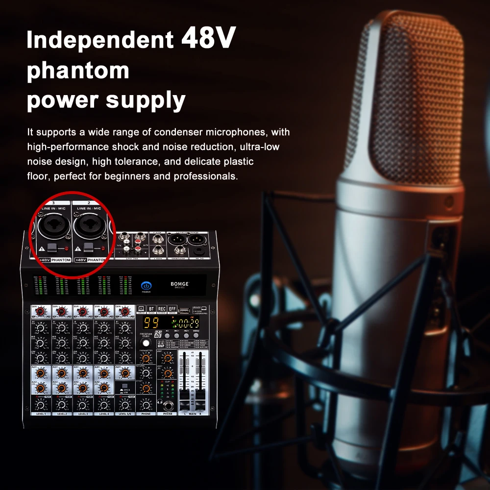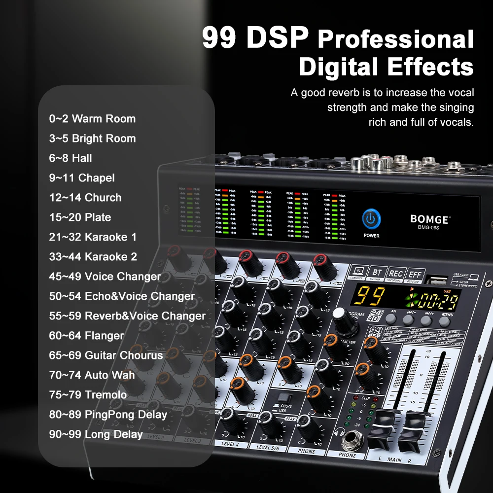 Professional 6 channels 99DSP Digital screen Audio mixer Sound Card DJ Mixing Console With USB Interface 48V MP3 for Recording