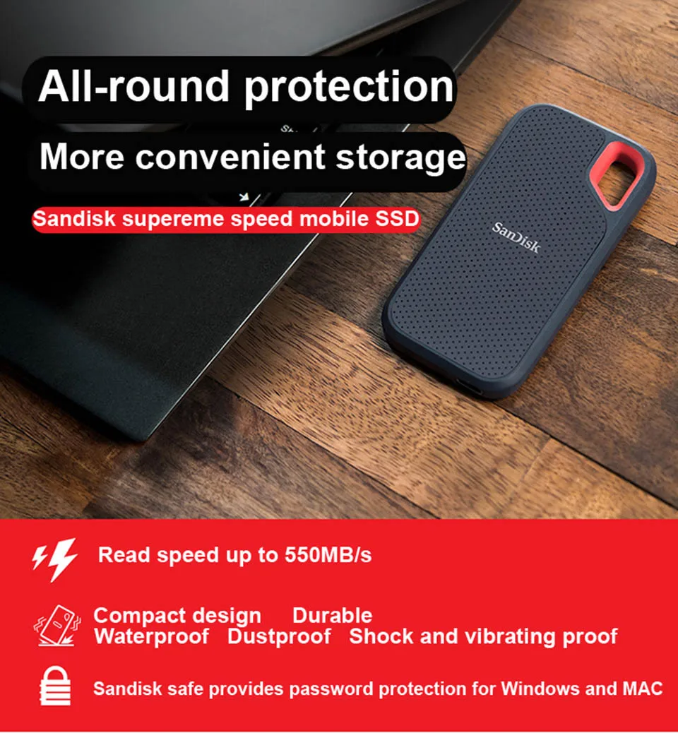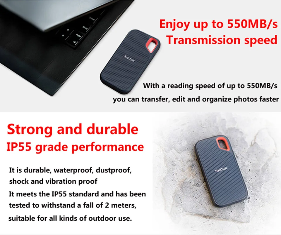 The rugged SanDisk Extreme Portable SSD delivers high-speed transfers with up to 550MB/s read speeds.This makes it perfect for saving and editing hi-res photos and videos. With an IP55 rating, it also stands up to rain, splashes, spills and dust.