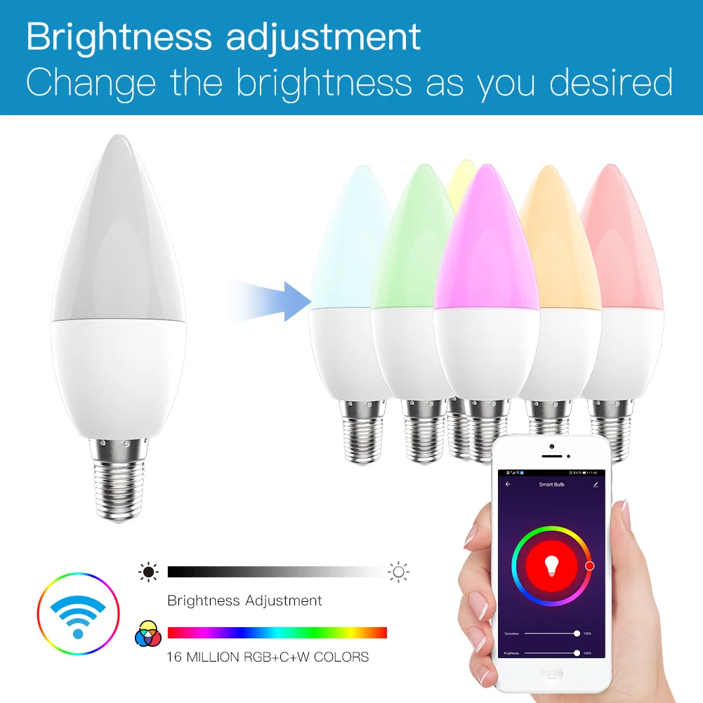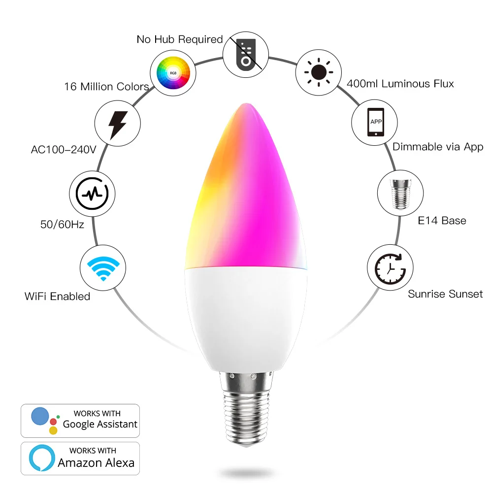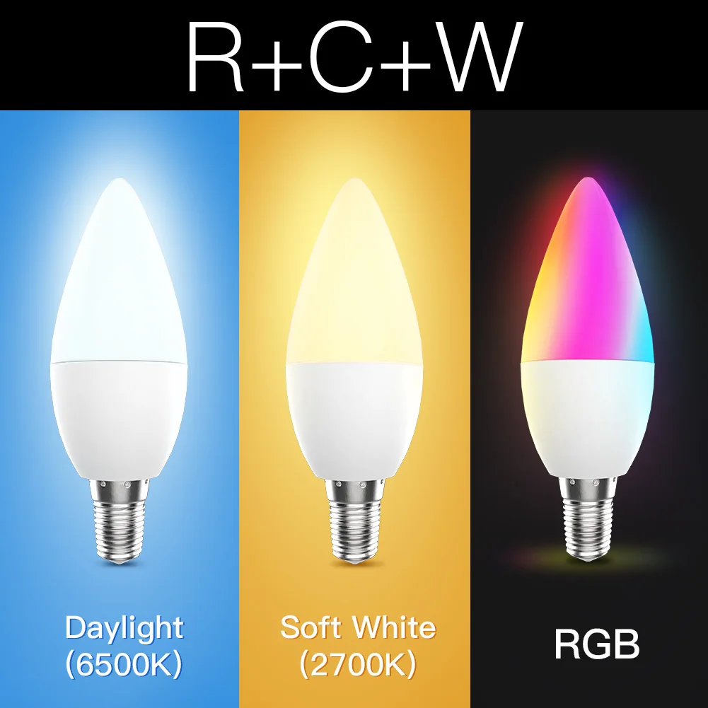 Smart WiFi LED Bulb E14 RGB 2700-6500K C+W 4.5W Dimmable Smart Life Tuya APP Remote Control Light Bulb Work with Alexa/Google Home for Voice Control