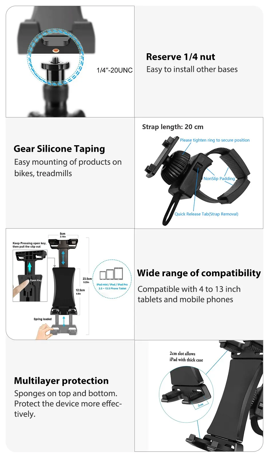 3. Adjustable tablet holder fits any tablet and Cell phone 4 to 13 Inch with or without a case or skin.