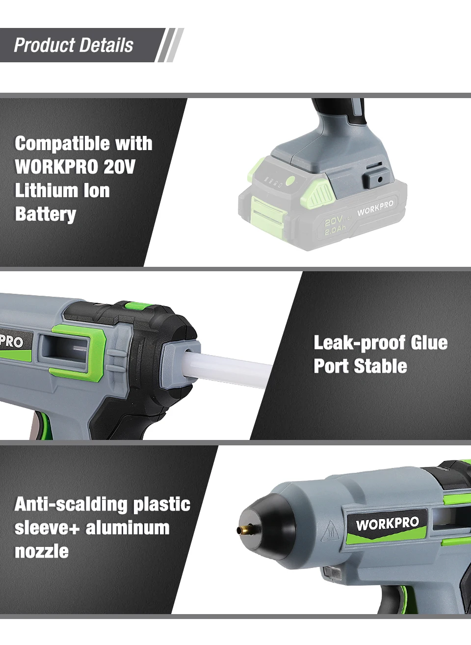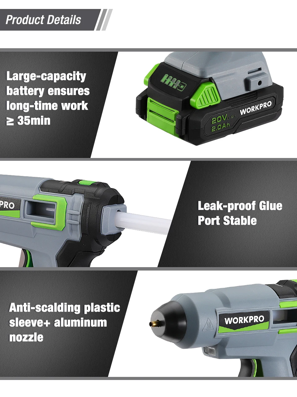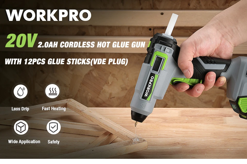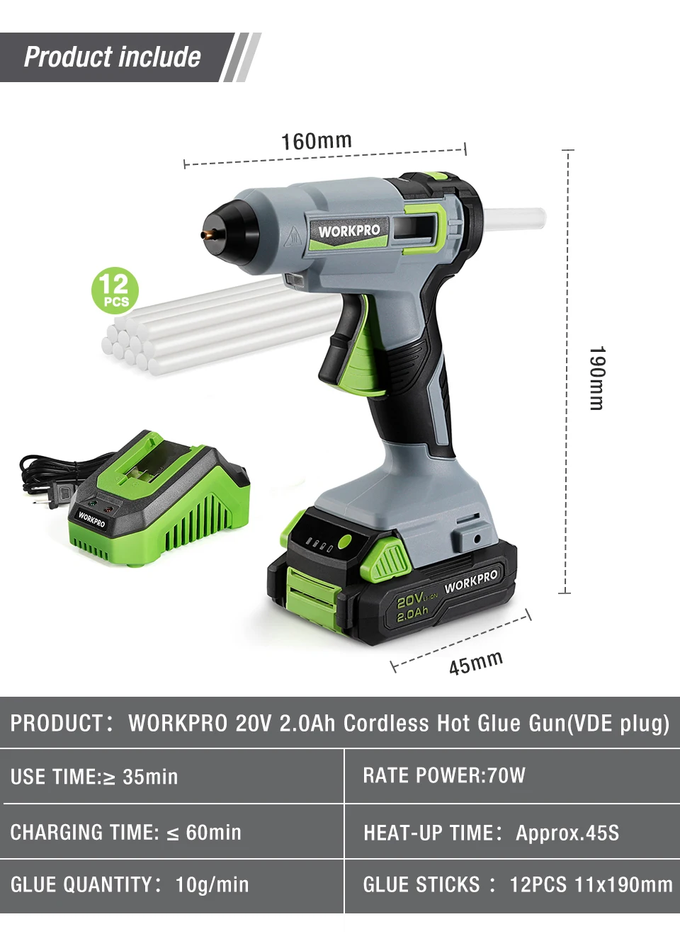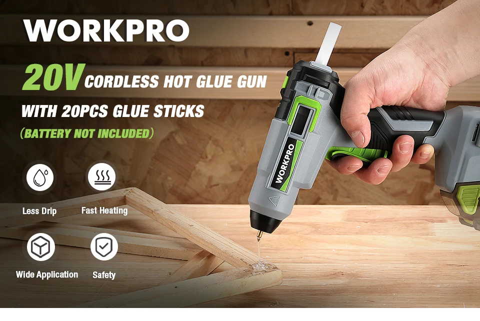 WORKPRO 20V Cordless Hot Glue Gun tool with 12/ 20pcs 11mm Glue Sticks Home DIY Electric Heat Repair Tool Replaceable Battery