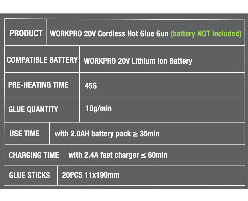WORKPRO 20V Cordless Hot Glue Gun tool with 12/ 20pcs 11mm Glue Sticks Home DIY Electric Heat Repair Tool Replaceable Battery - Frontier General Hardware