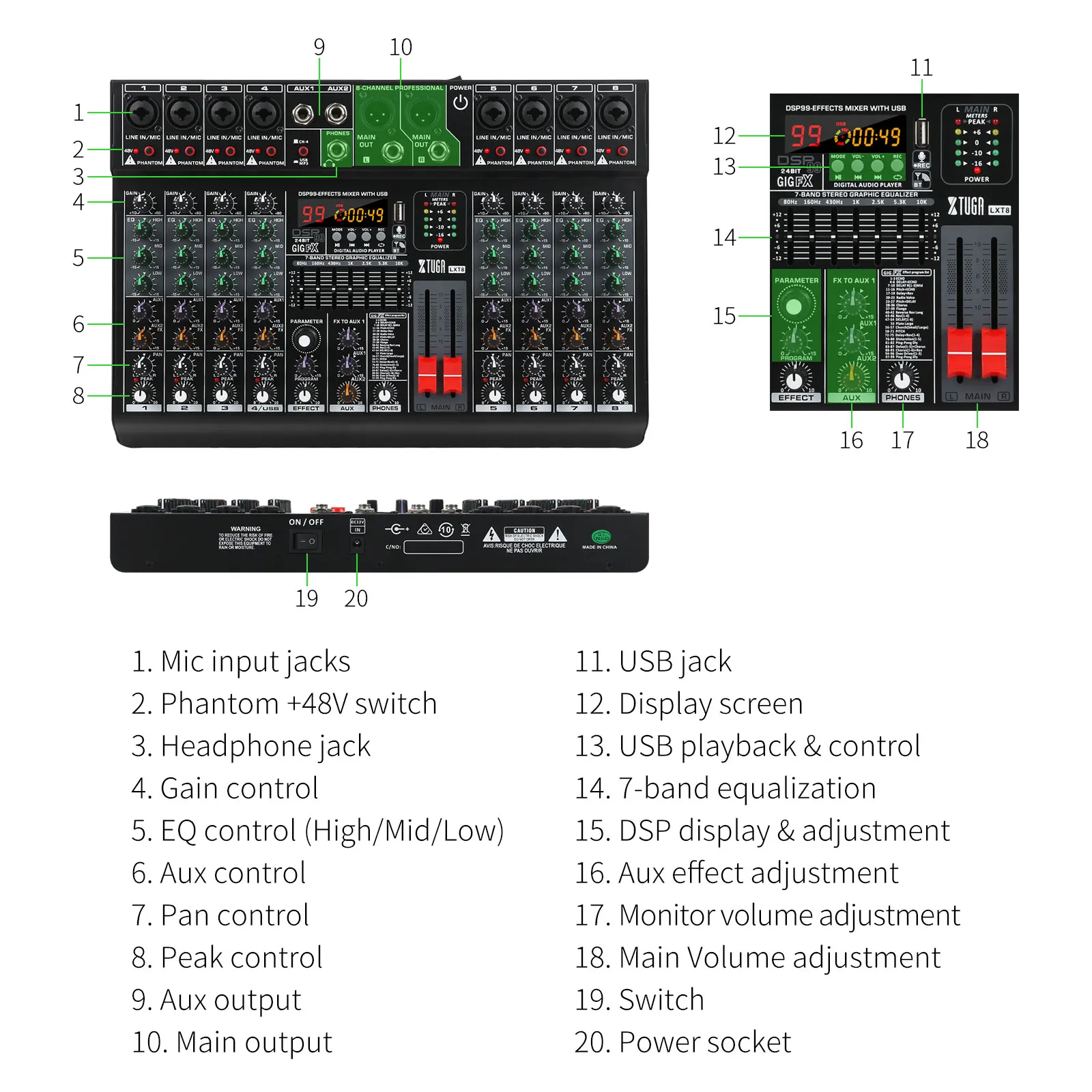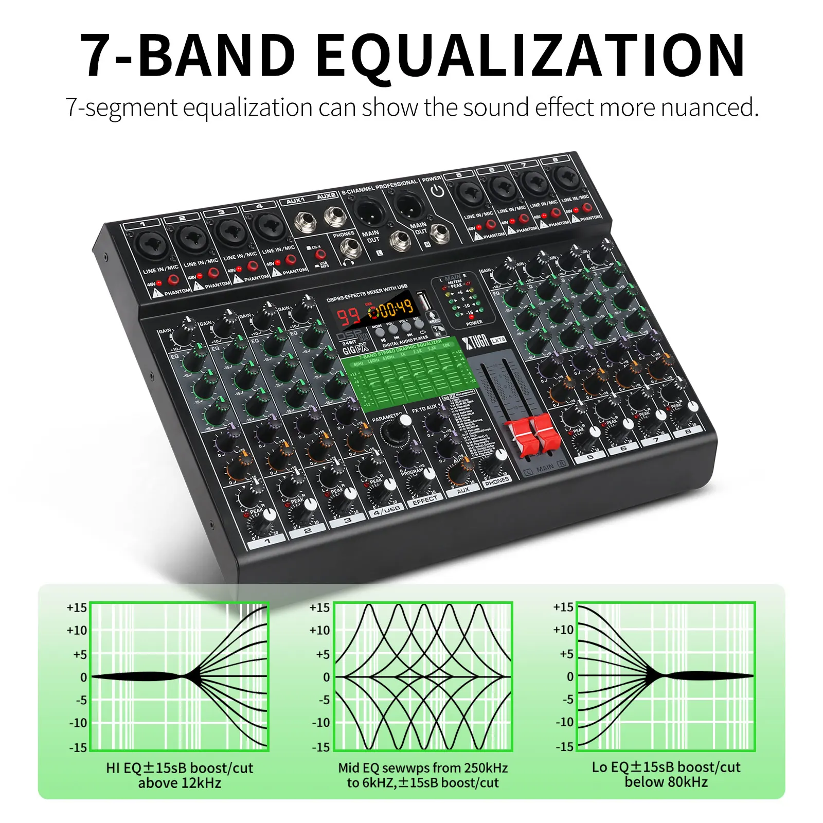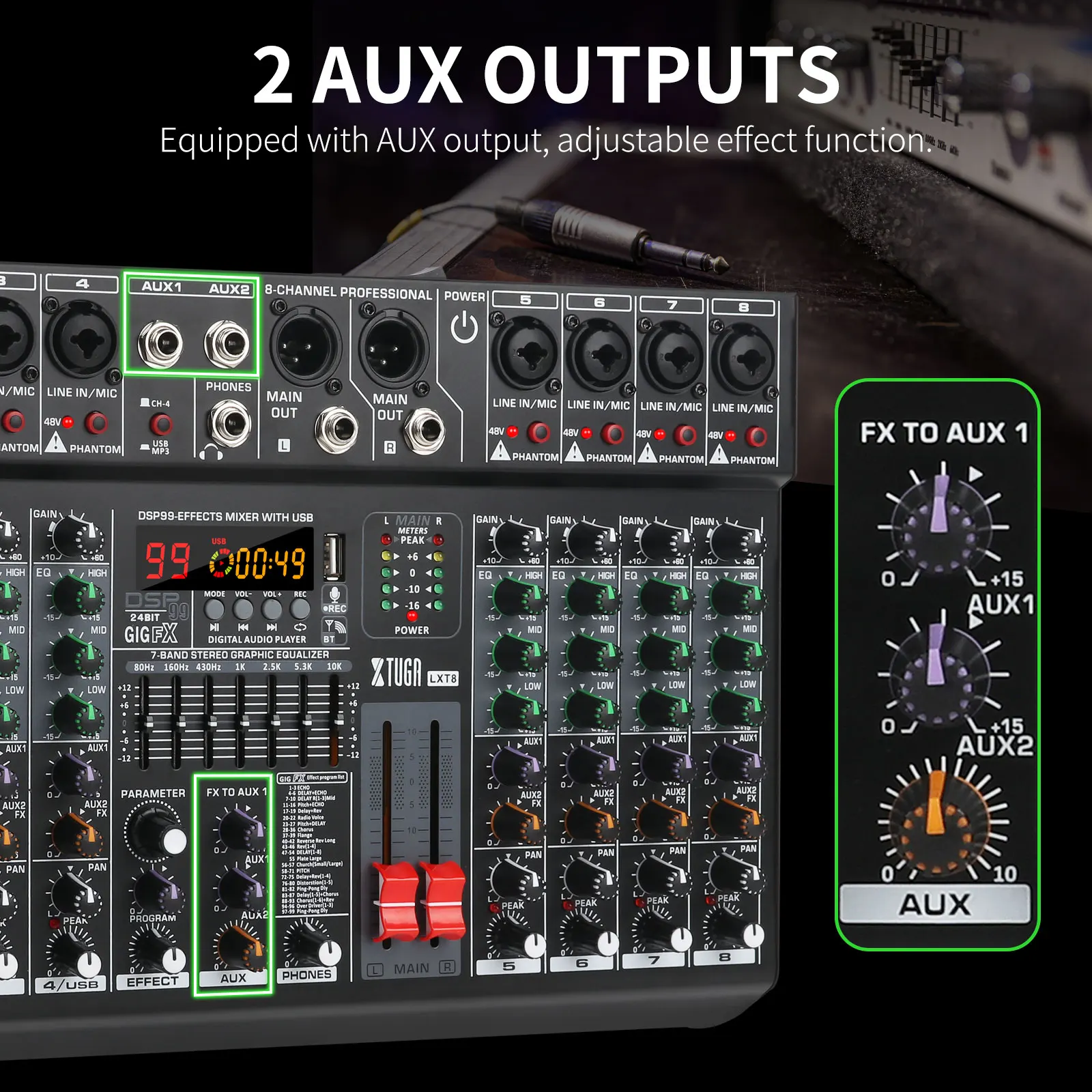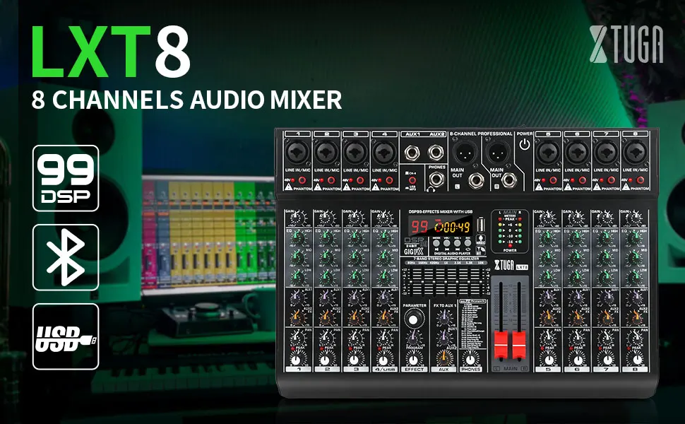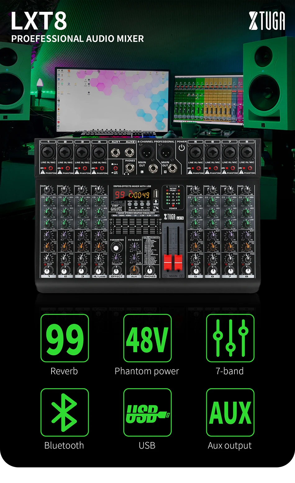 XTUGA LXT8 Professional DJ Mixer 8-Channel Mixer Supports 48V Wanda Power With 99 DSP Effects For Stage Tuning Recording Studio