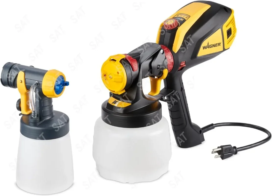 The Wagner FLEXiO 595 applies a consistent finish on indoor and outdoor home improvement projects and is 10X faster than a brush to get projects done quickly. The sprayer comes with an iSpray nozzle for large projects and Detail Finish nozzle for fine finishing.