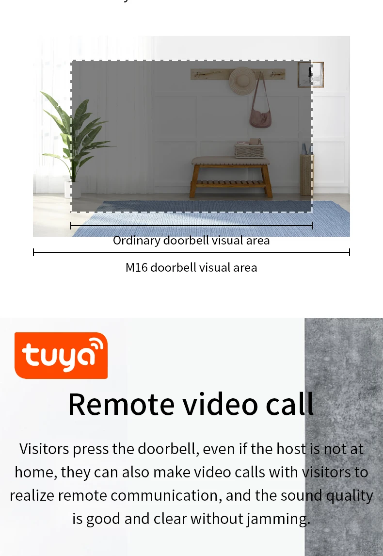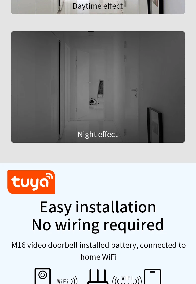 - Easy installation, no wiring required. M16 video doorbell installed battery , connected to home WIFI.