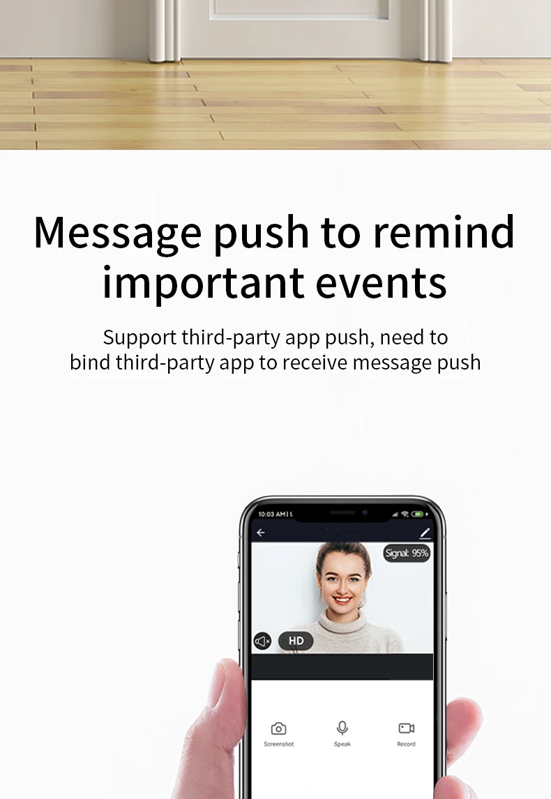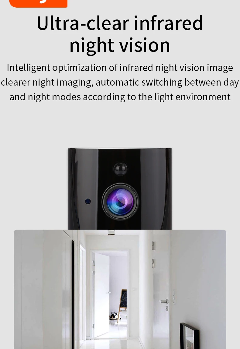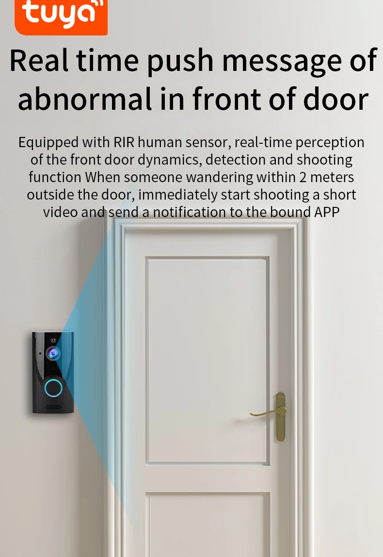 - Support PIR human infrared detection, real time push message of abnormal in front of door. When someone wandering within 2 meters outside the door, immediately start shooting a short video and send a notification to the Tuya APP.